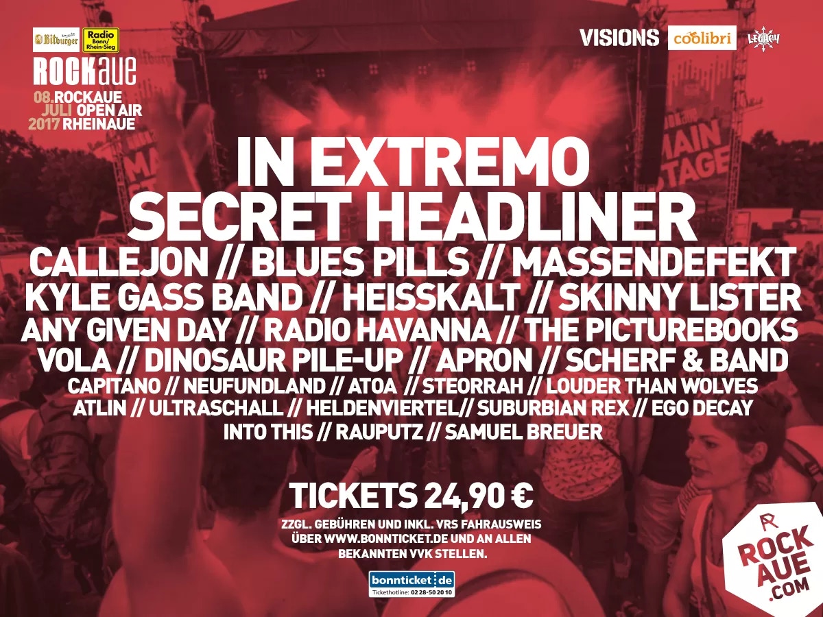 Die Bonner Rheinaue ist schon eine klasse Grünanlage direkt am Rhein. Eingezäunt standen überall Fressbuden und die drei Bühnen, und natürlich der VIP-Bereich für die, die 99,00 Euro für ein Ticket ausgegeben haben: Freie Getränke und Grillgut den ganzen Tag bis in die Nacht hinein, Liegestühle.. ach, so kann man es sich gut gehen lassen – und das bei heißen Temperaturen, ein perfekter Tag.